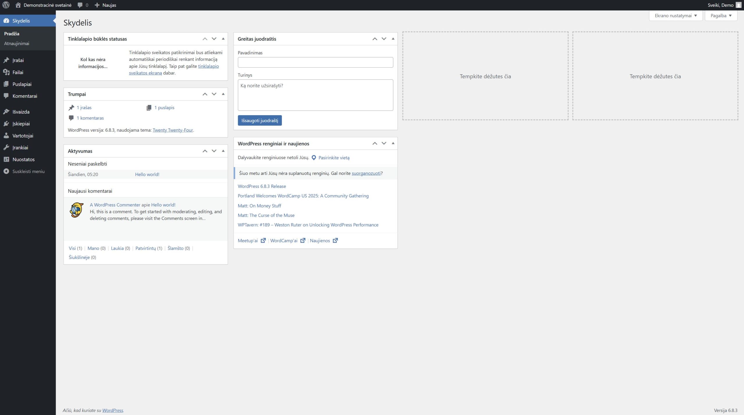Sėkmingai prisijungus prie „WordPress“ svetainės, Jus pasitinka valdymo skydelis (angl. Dashboard). Tai yra Jūsų svetainės valdymo centras, iš kurio galite kontroliuoti visą turinį, išvaizdą ir funkcionalumą.