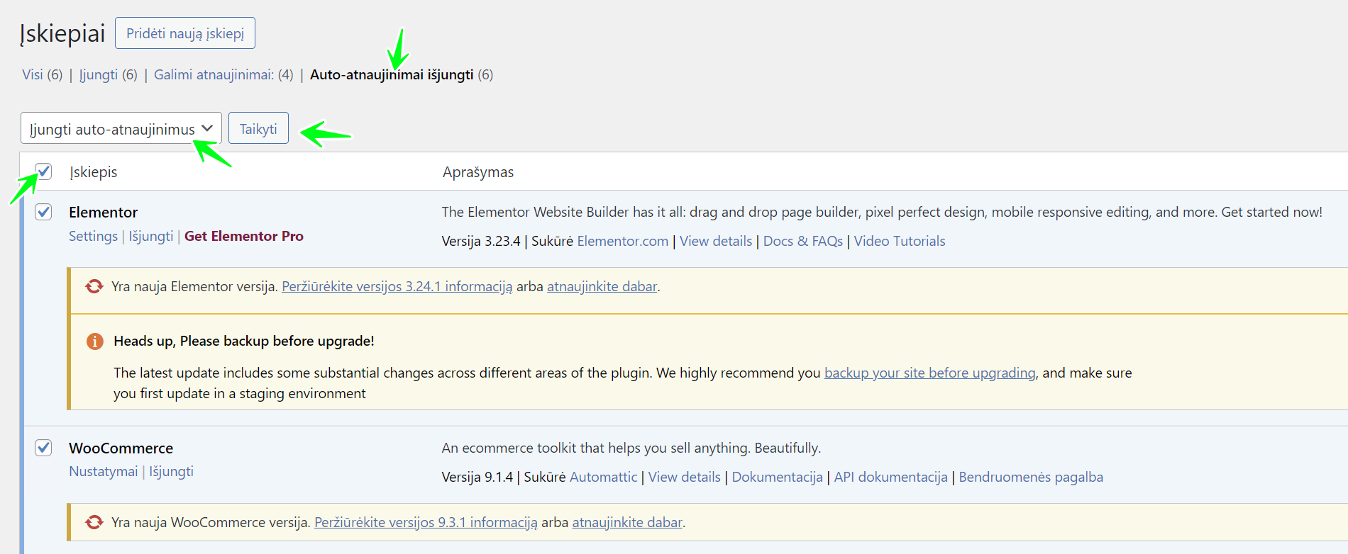 Administraciniame skydelyje „Įskiepiai“ > „Įdiegti įskiepiai“ atidarykite skirtuką „Auto-atnaujinimai išjungti“, pažymėkite varnele visus įskiepius ir masinių veiksmų pagalba taikykite „Įjungti auto-atnaujinimus“ veiksmą.