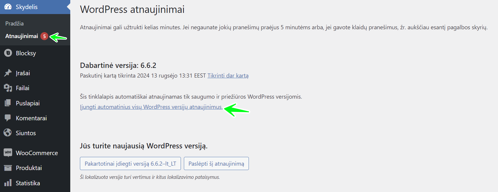 2. Pamatysite pranešimą, informuojantį apie esamą būseną. Spauskite nuorodą „Įjungti automatinius visų WordPress versijų atnaujinimus“.