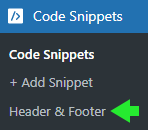 Įjungus įskiepį, kairiajame valdymo skydelio meniu atsiras nauja skiltis Code Snippets. Eikite į Code Snippets -> Header & Footer.