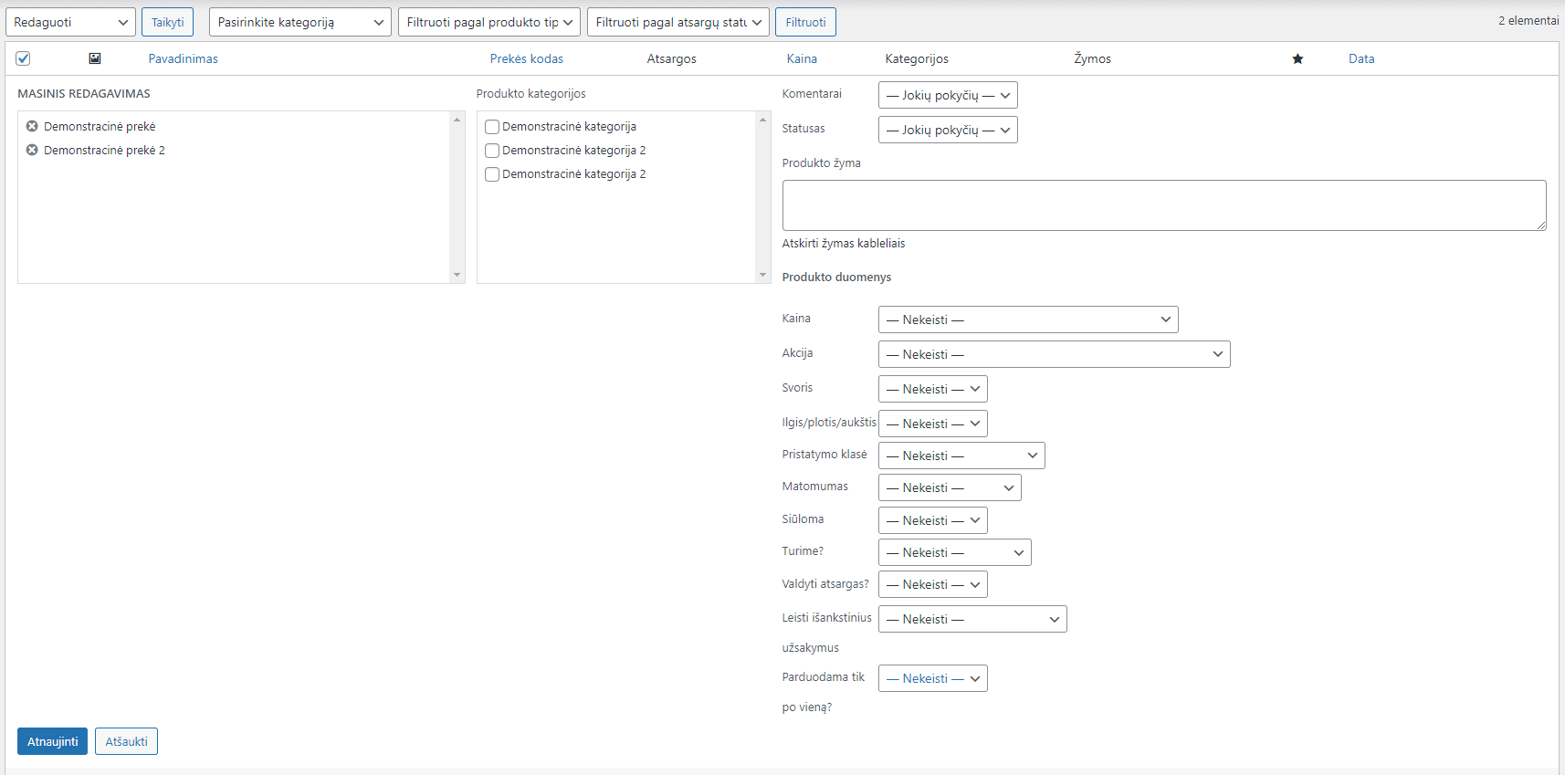 Ši funkcija leidžia vienu veiksmu pakeisti daugelio prekių nustatymus, pavyzdžiui, kainą, atsargų būseną ar priskirti naują kategoriją.