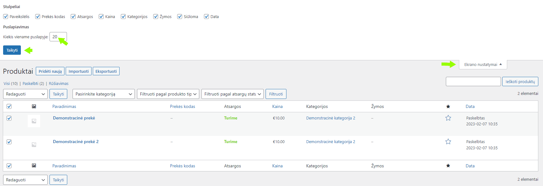 - Keisti rodomų prekių skaičių: Jei norite matyti ir redaguoti daugiau nei 20 prekių viename puslapyje, čia galite įvesti didesnį skaičių.