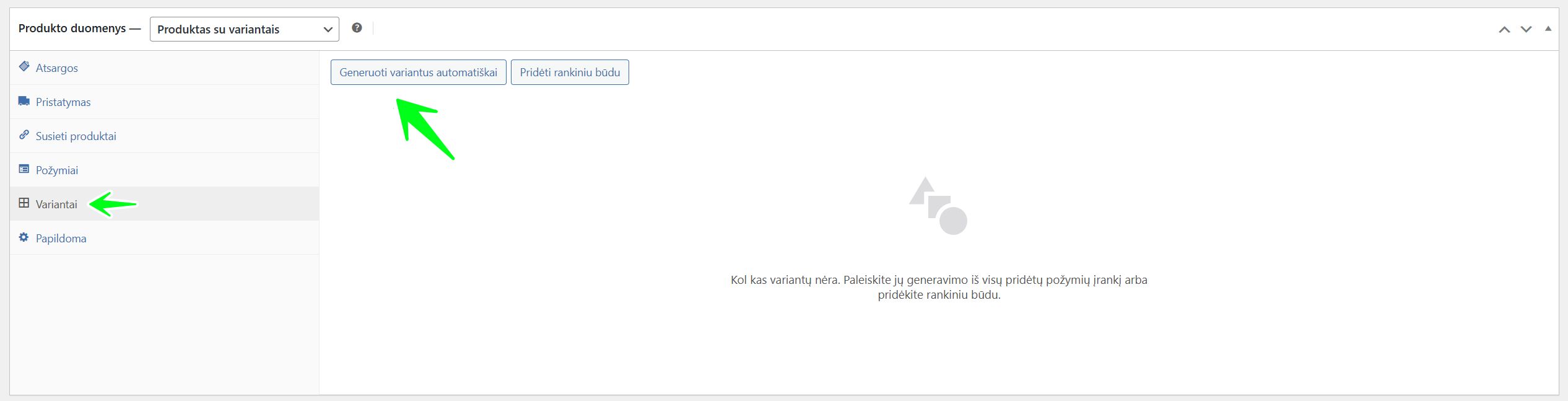 Produkto su variantais nustatymai: