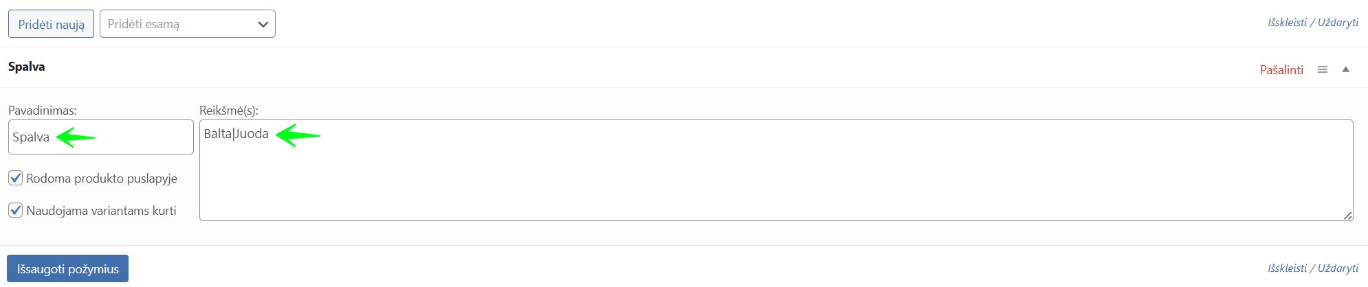 - Eikite į skiltį Požymiai (Attributes). Išskleidžiamajame meniu pasirinkite arba sukurkite naują atributą (pvz., „Spalva“).