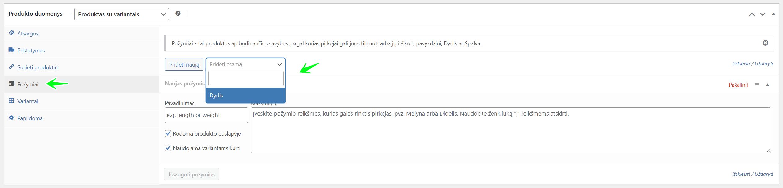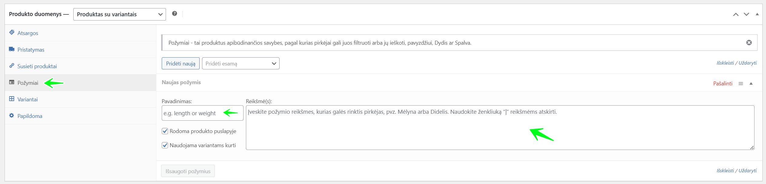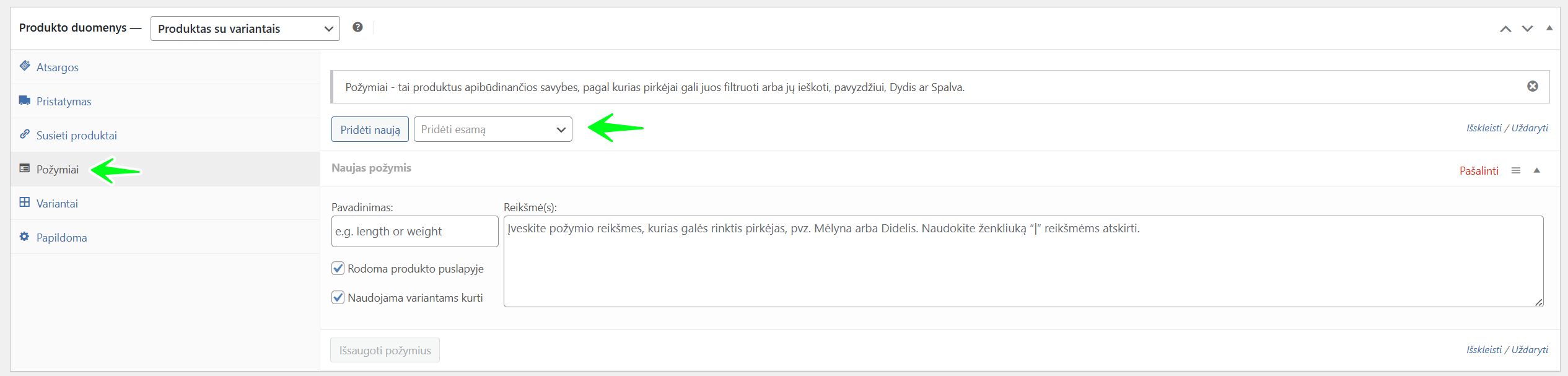 - Pavadinimas: Įveskite atributo pavadinimą, kurį matys pirkėjai (pvz.,
