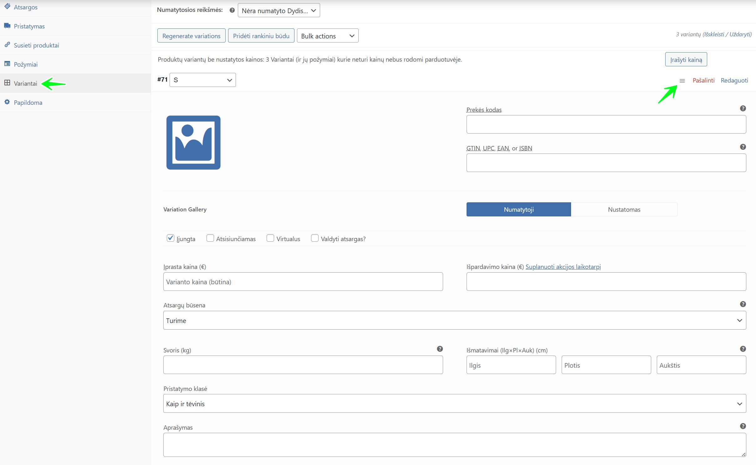 - Variacijos paveikslėlis (maža fotoaparato piktograma): Labai svarbu! Įkelkite nuotrauką, atitinkančią būtent šią variaciją (pvz., mėlynų marškinėlių nuotrauką). Kai pirkėjas pasirinks šį variantą, pagrindinė prekės nuotrauka pasikeis į šią.