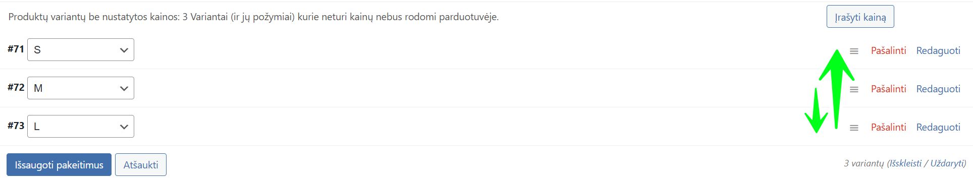 Norėdami pakeisti, kokia tvarka pirkėjui rodomi pasirinkimai išskleidžiamajame meniu (pvz., kad pirmiau būtų S, tada M, tada L dydis), galite tiesiog pele paimti variaciją už trijų brūkšnelių piktogramos (☰) ir nutempti ją į norimą poziciją sąraše.
