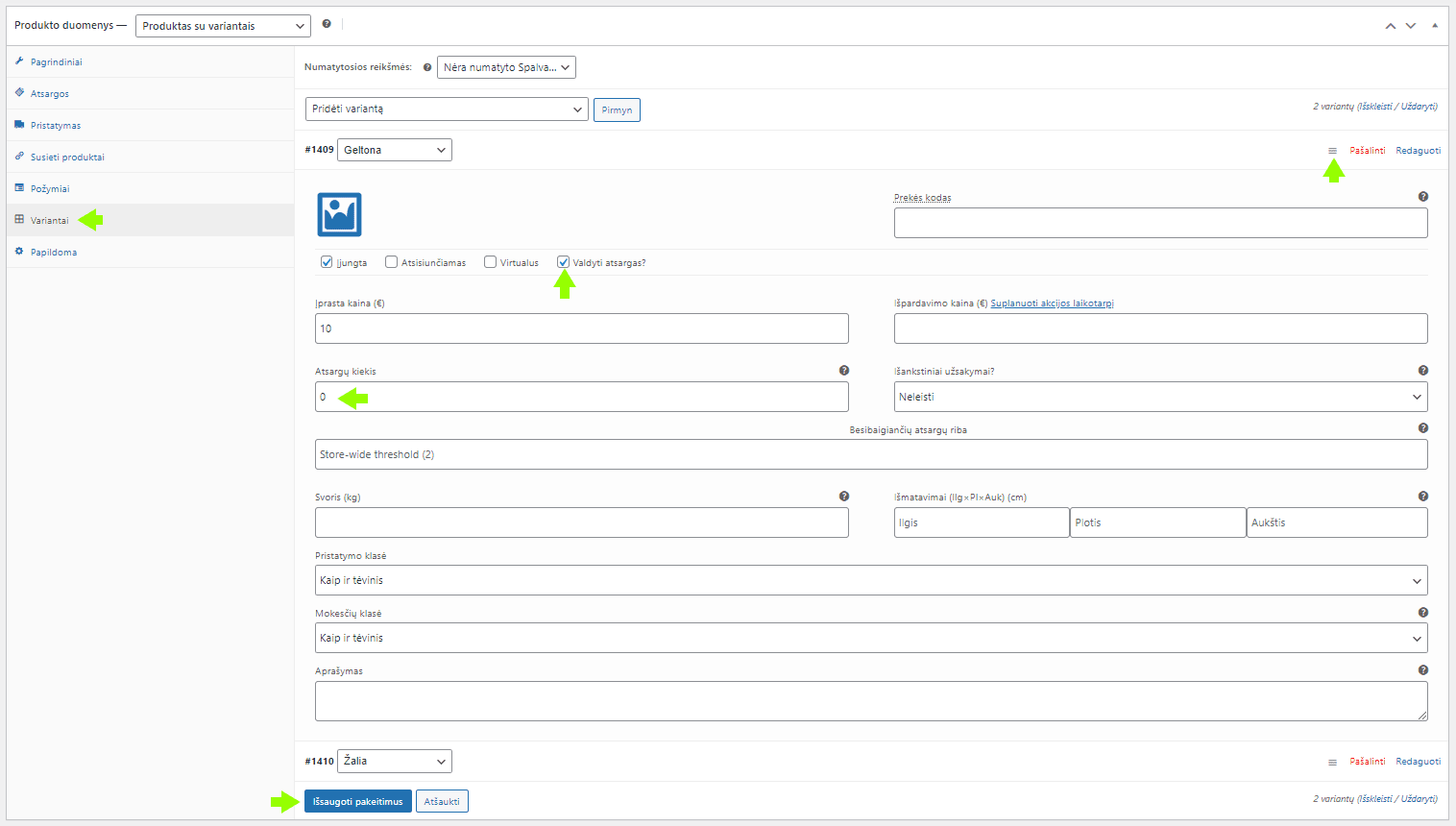 Jei prekė turi variantų (pvz., skirtingų dydžių ar spalvų), atsargos valdomos kiekvienai variacijai atskirai.