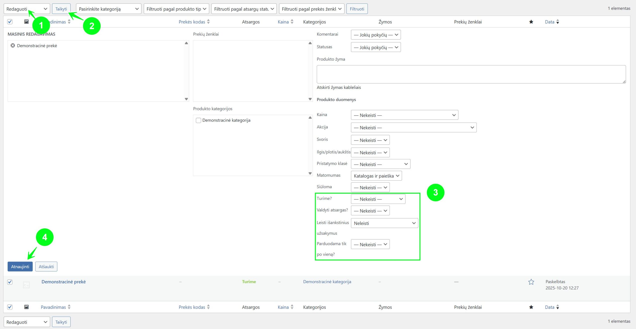 Produktai -> Visi produktai) galite pažymėti kelias prekes, pasirinkti „Redaguoti“ iš išskleidžiamojo meniu ir vienu veiksmu pakeisti jų atsargų būseną.