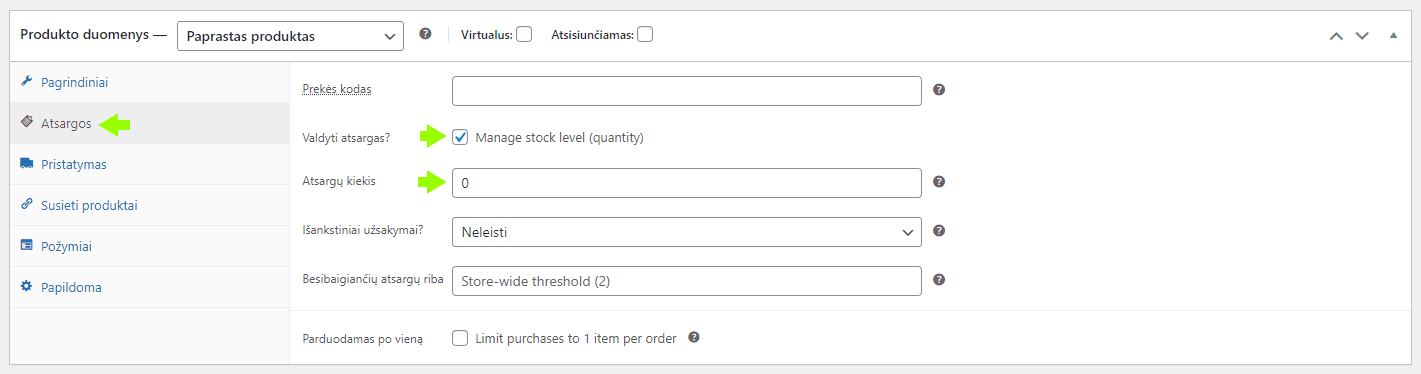 Svarbu: Kai gausite naują prekių siuntą, Jums reikės rankiniu būdu atnaujinti „Atsargų kiekį“. „WooCommerce“ gali tik automatiškai mažinti likutį, bet ne jį didinti.