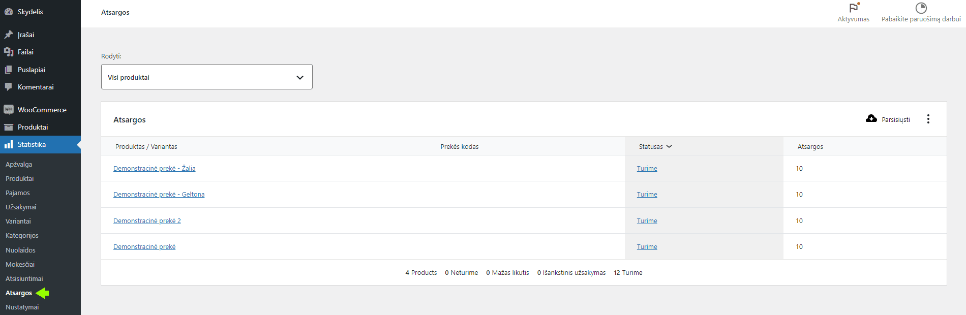 Norėdami greitai įvertinti bendrą atsargų būklę, galite pasinaudoti ataskaitomis. Eikite į Statistika -> Atsargos.