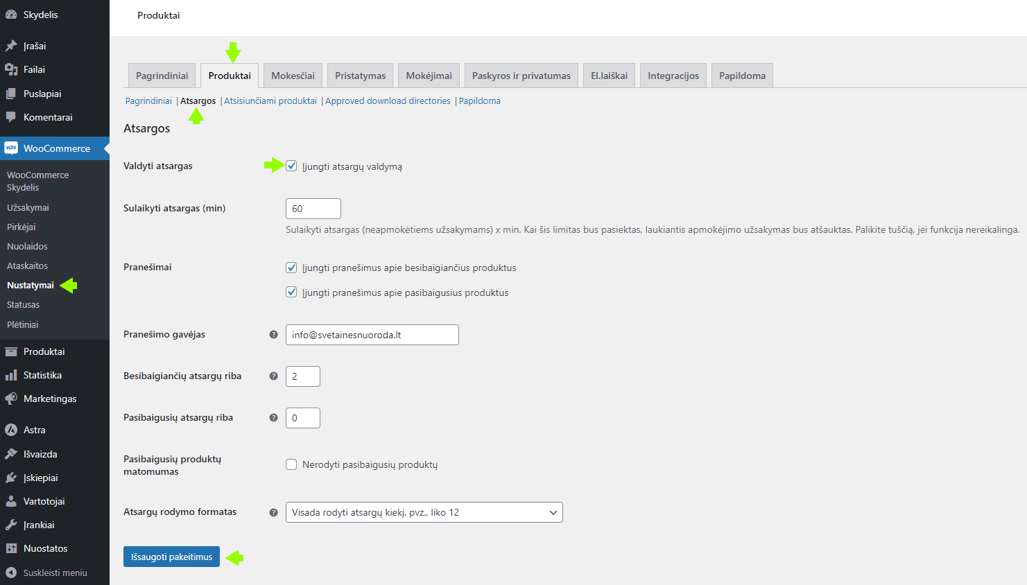 - Įjungti atsargų valdymą: Būtinai pažymėkite šią varnelę. Tai leis „WooCommerce“ automatiškai sekti ir mažinti prekių likučius.