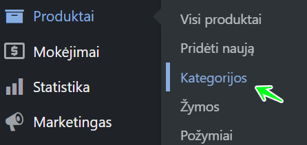 Kairiajame valdymo skydelio meniu eikite į Produktai -> Kategorijos.