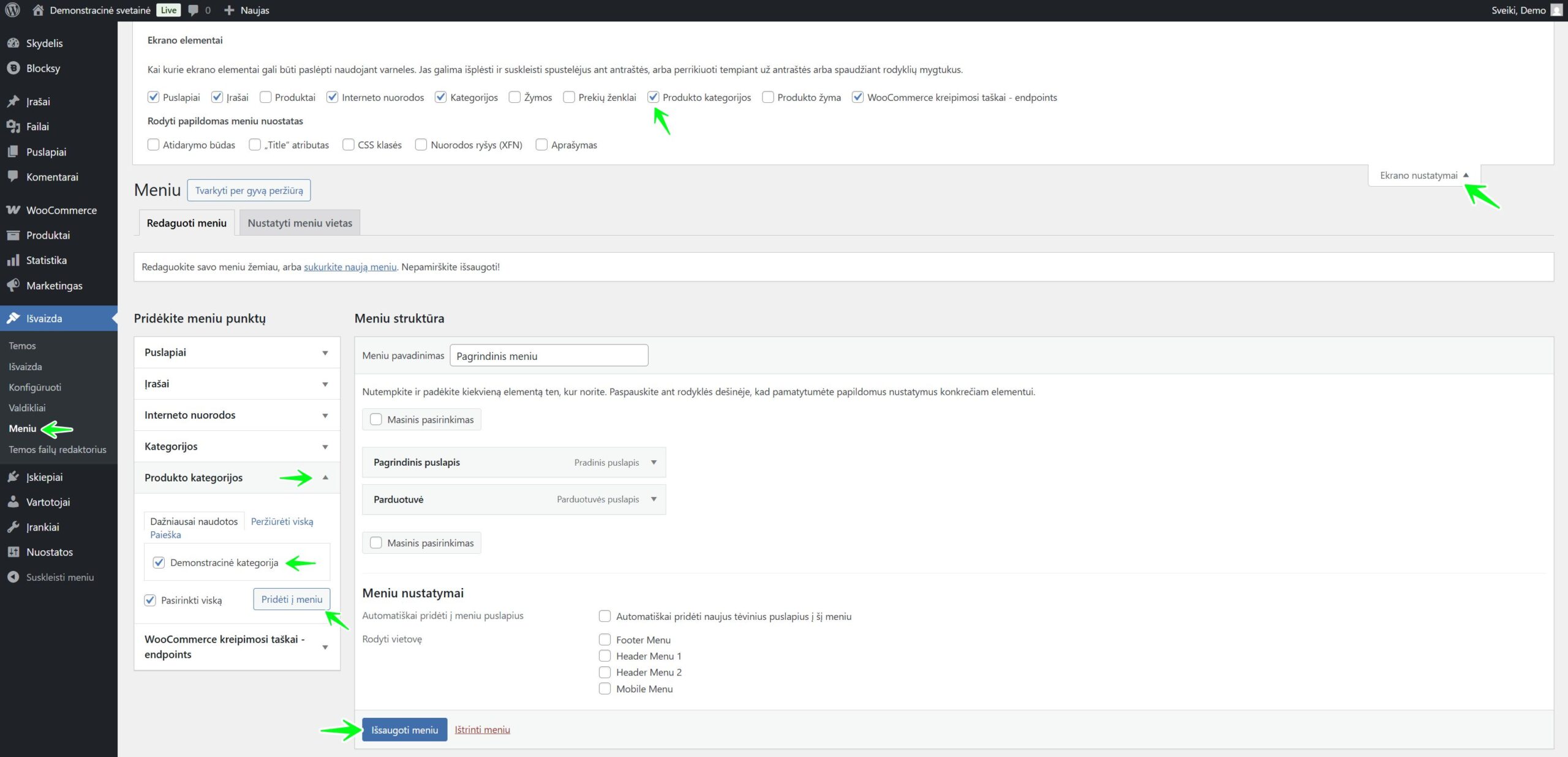 Dažnai norima, kad pagrindinės prekių kategorijos būtų matomos svetainės navigacijos meniu. Tai padaryti galite per meniu valdymo skiltį: