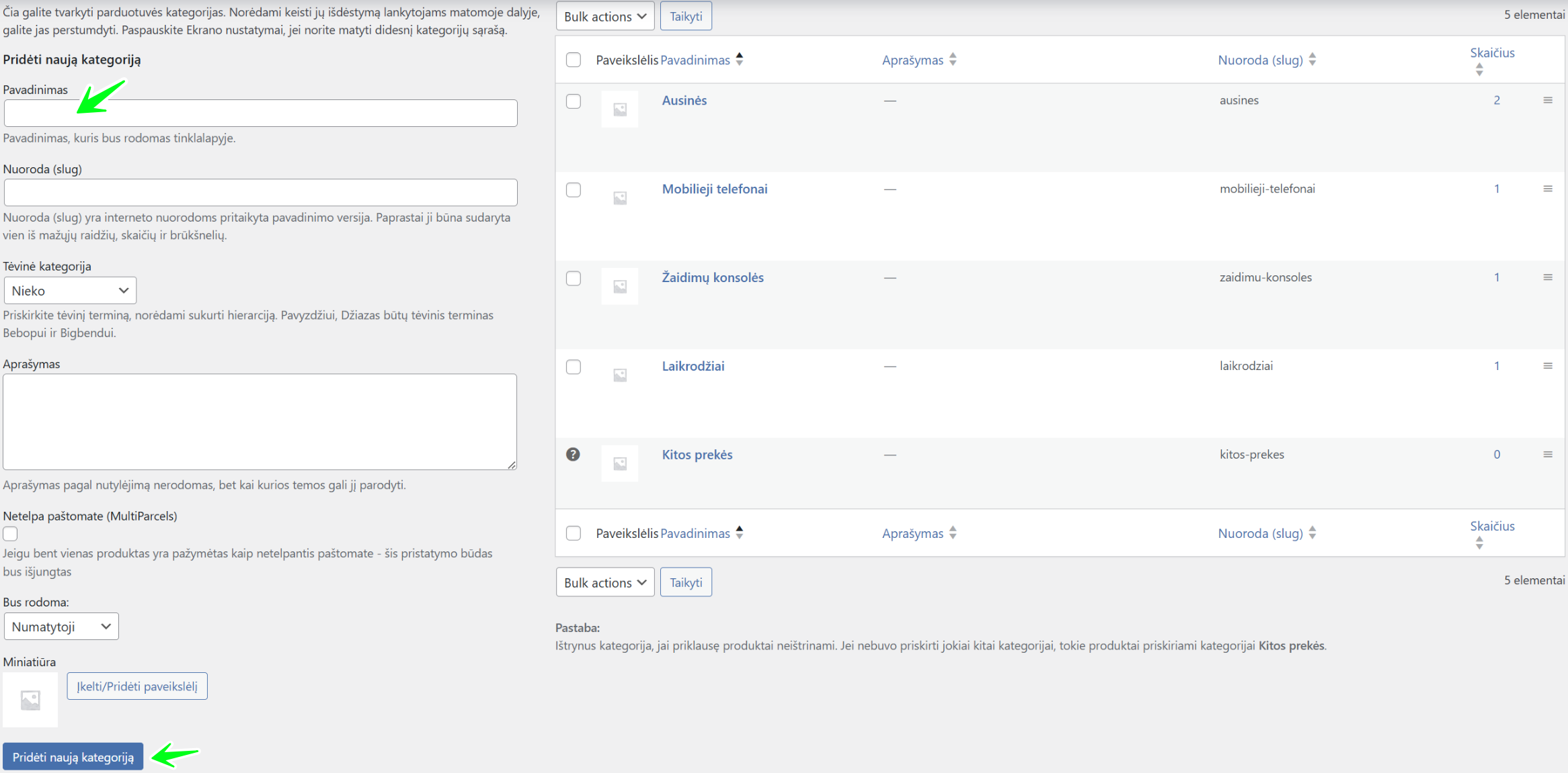 • Aprašymas: Čia galite įvesti išsamesnį kategorijos aprašymą. Ar šis aprašymas bus matomas pirkėjams, priklauso nuo Jūsų svetainės temos nustatymų.