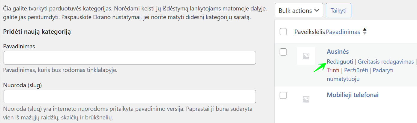 • Greitasis redagavimas: Leidžia greitai pakeisti kategorijos pavadinimą ir trumpinį (slug) neatidarant naujo puslapio.