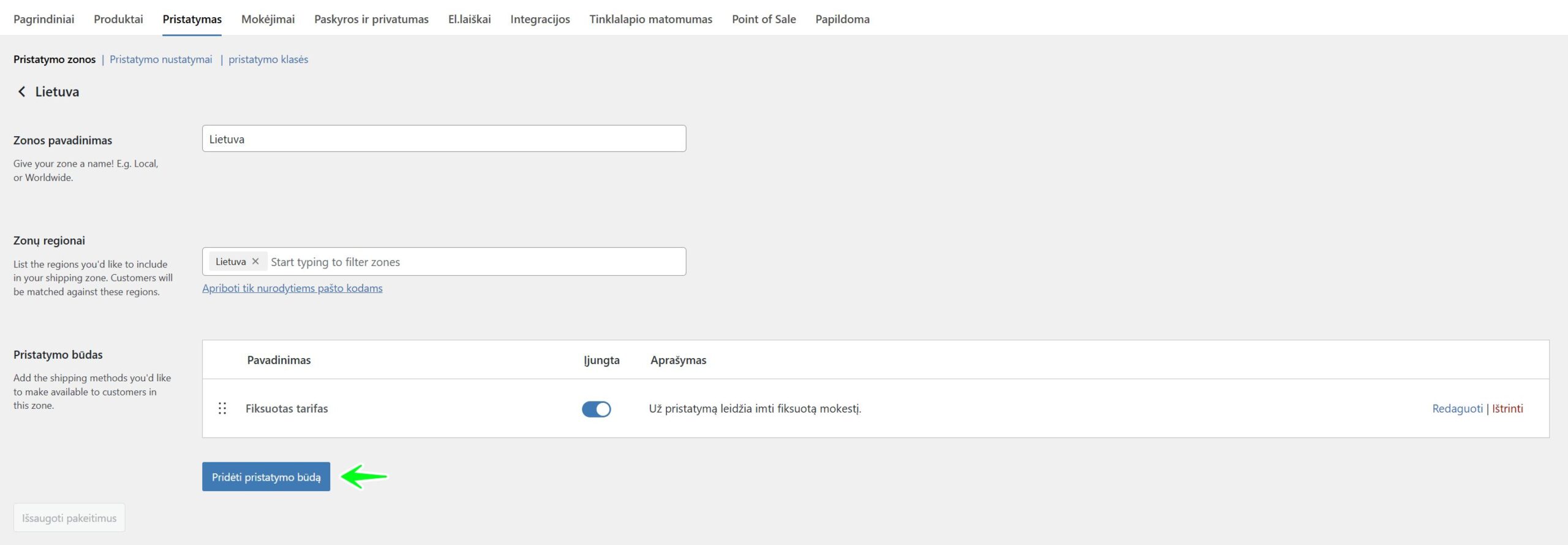 Sukūrus zoną, ji yra tuščia – dabar reikia į ją įdėti pristatymo būdus, kuriuos matys pirkėjai iš tos zonos.