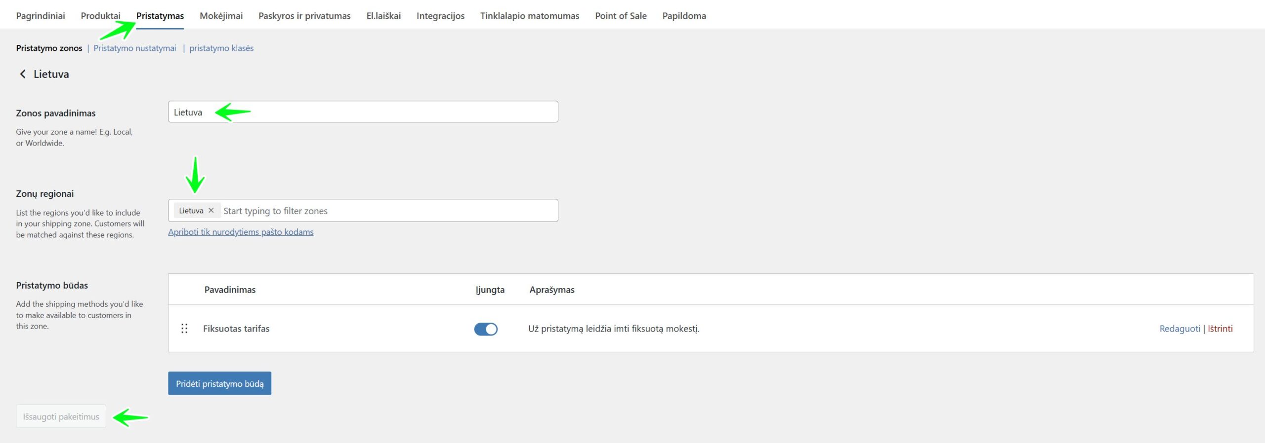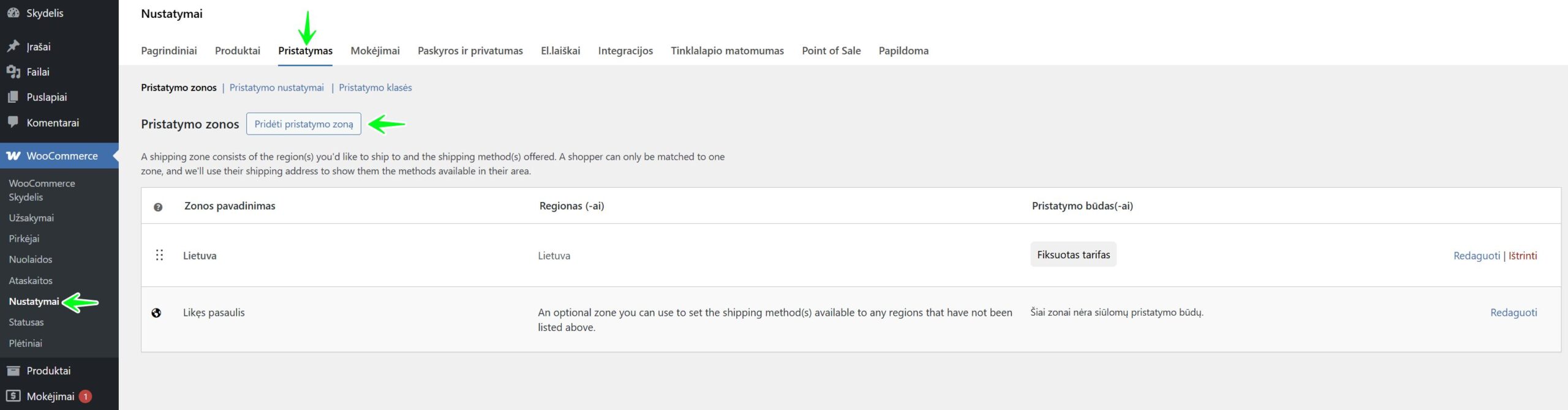 - Pristatymo Zonos (Shipping Zones): Tai geografiniai regionai, į kuriuos planuojate siųsti prekes. Pirkėjo adresas yra palyginamas su Jūsų sukurtomis zonomis, ir jam pasiūlomi tik tai zonai priskirti pristatymo būdai.