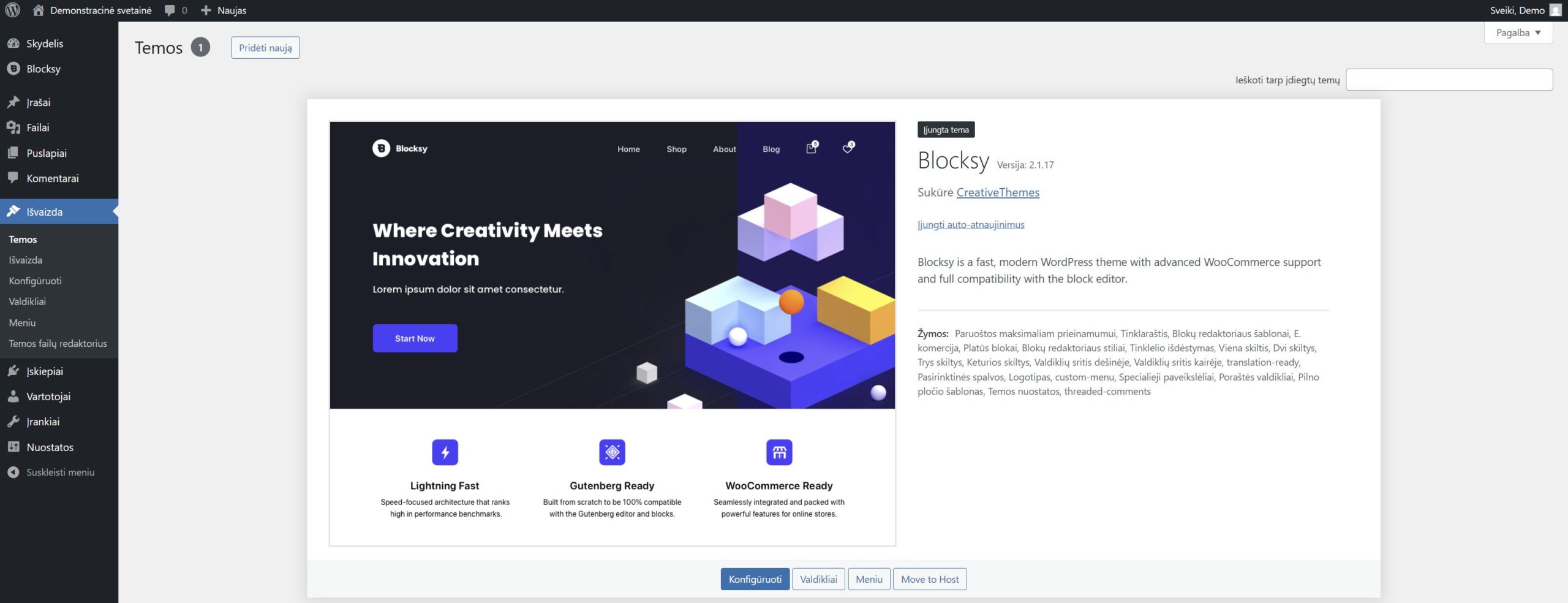 - Valdikliai (Widgets): Nebėra specialių „valdiklių sričių“. Vietoje to, į šoninę juostą ar poraštę galite įdėti bet kokį norimą bloką (pvz., „Naujausi įrašai“, „Paieška“ ir t.t.).