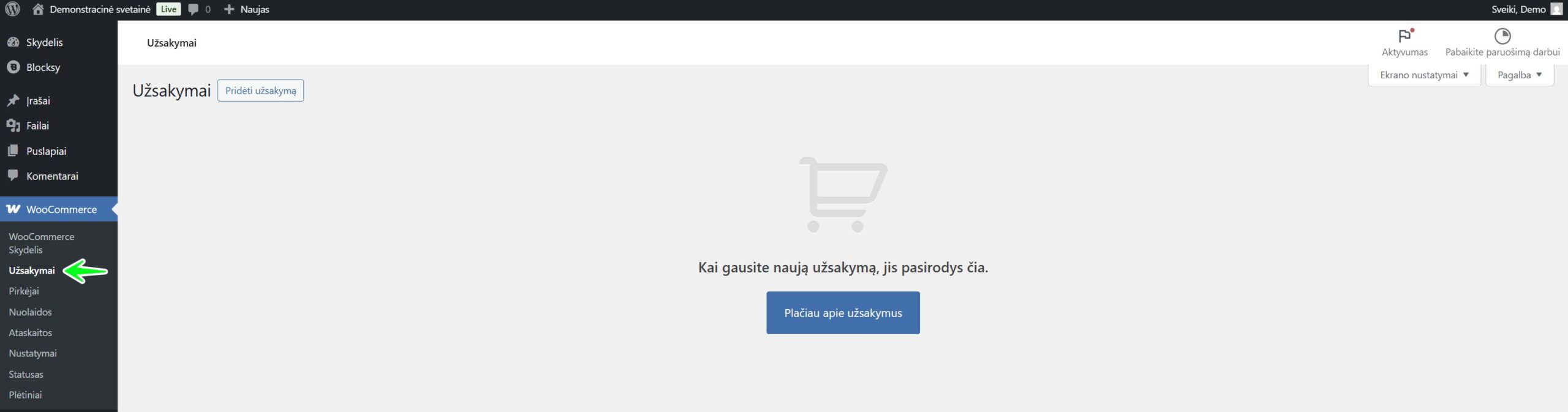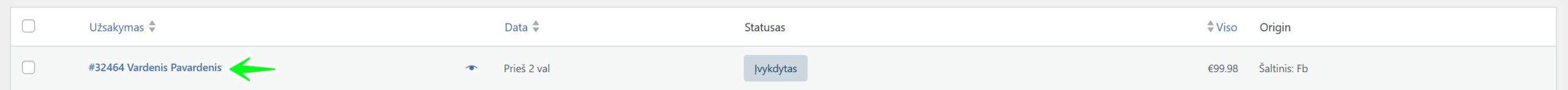 Visus gautus užsakymus galite rasti nuėję į WooCommerce -> Užsakymai. Tai yra pagrindinis Jūsų užsakymų puslapis.