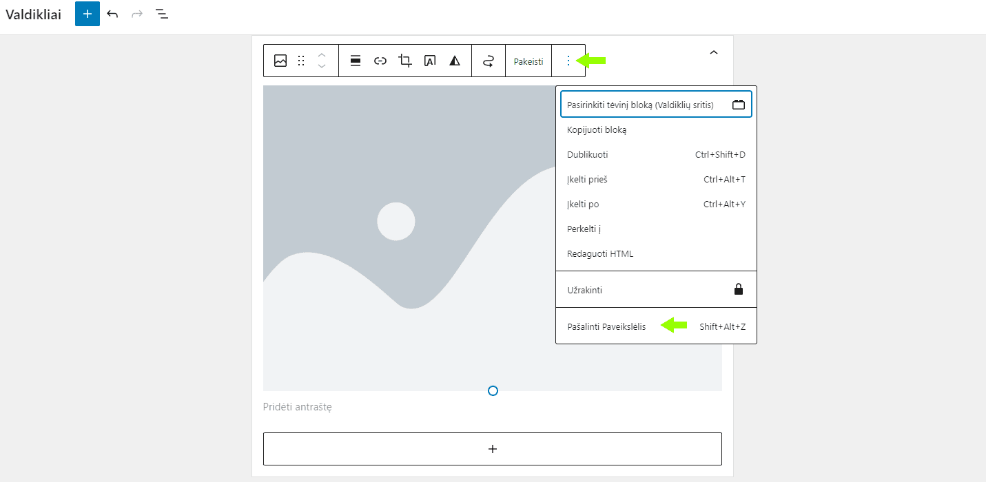 - Virš bloko atsiradusioje įrankių juostoje paspauskite trijų taškų piktogramą (⋮).