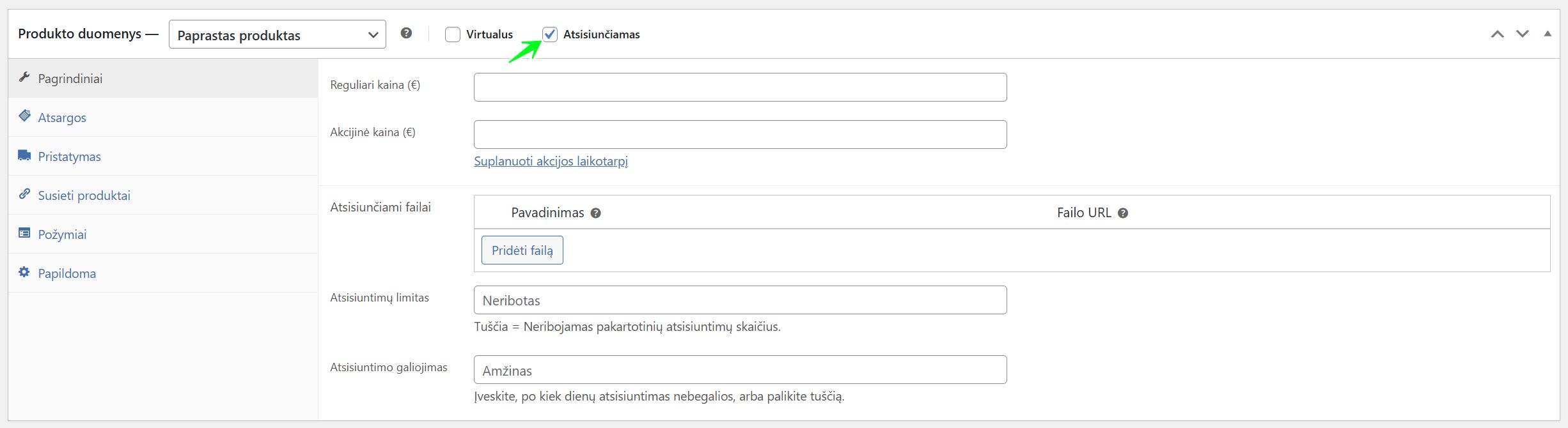 ✅ Atsisiunčiamas (Downloadable): Pažymėjus šią varnelę, prekės nustatymuose atsiranda papildomi laukeliai failams įkelti ir atsisiuntimo taisyklėms nustatyti.