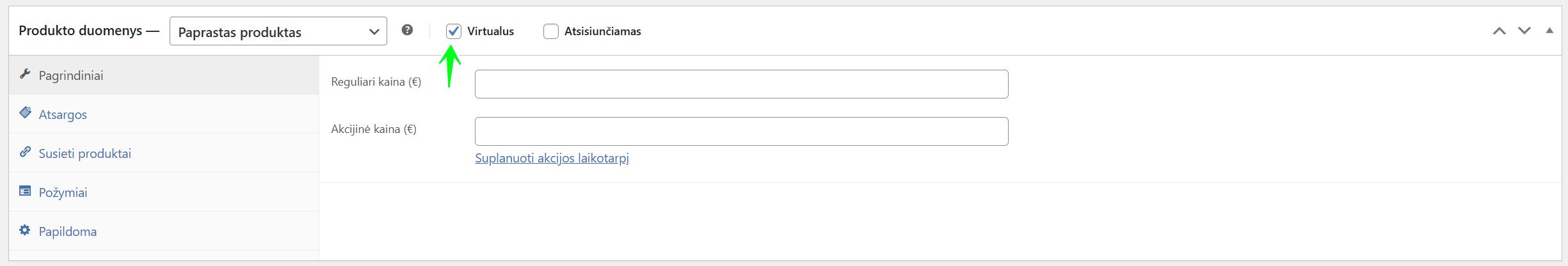 ✅ Virtualus (Virtual): Pažymėjus šią varnelę, iš prekės nustatymų dingsta „Pristatymo“ (Shipping) skiltis. Sistema supranta, kad šios prekės nereikia siųsti, todėl pirkėjui nereikės įvesti pristatymo adreso. Šią varnelę reikia žymėti visoms ne fizinėms prekėms.